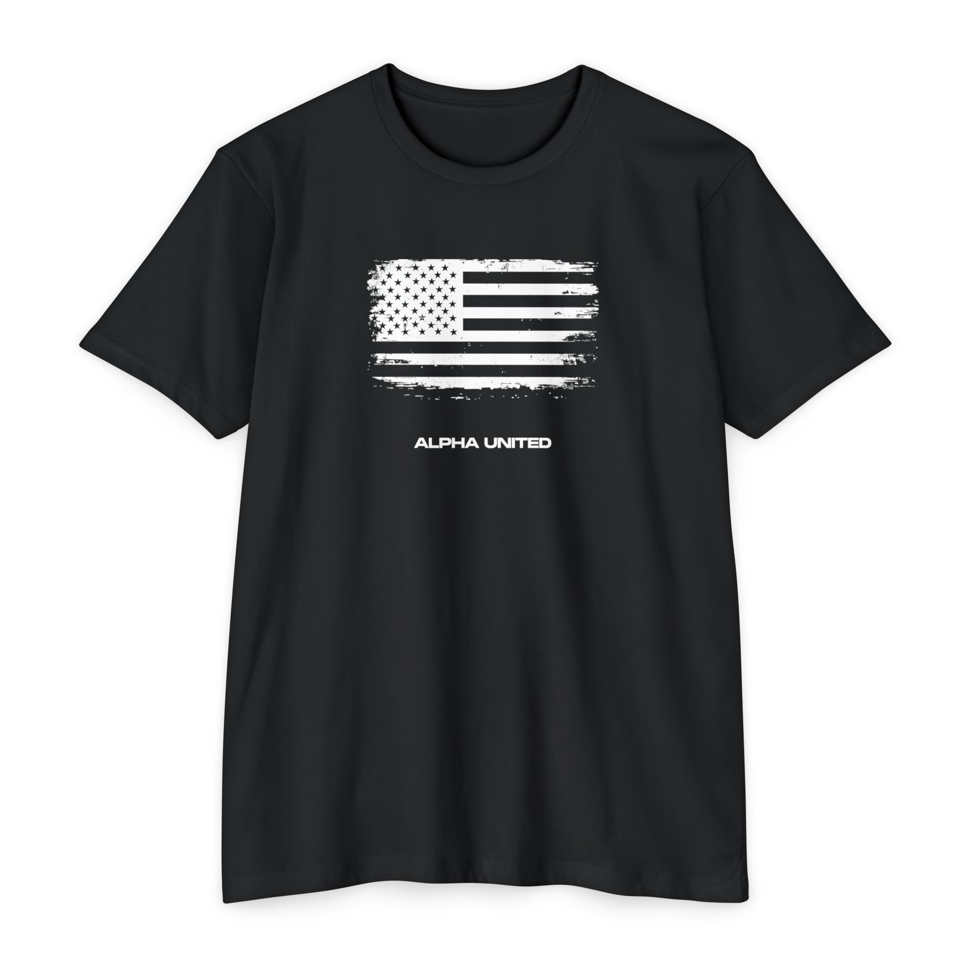 - Front: Distressed American flag + "ALPHA UNITED" text