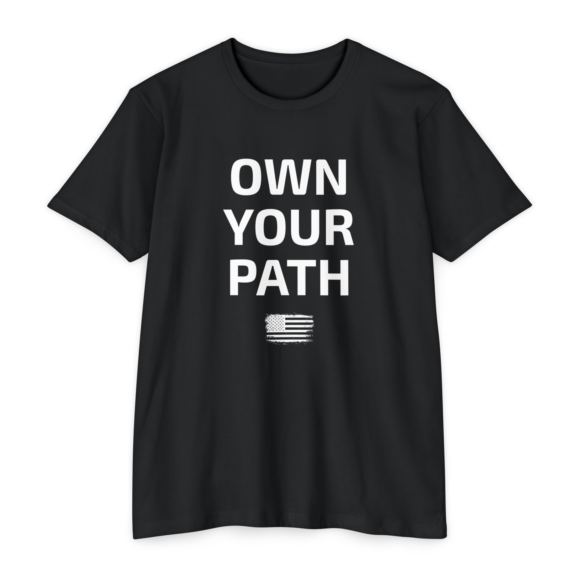 - Front: "Own Your Path" + distressed American flag graphic