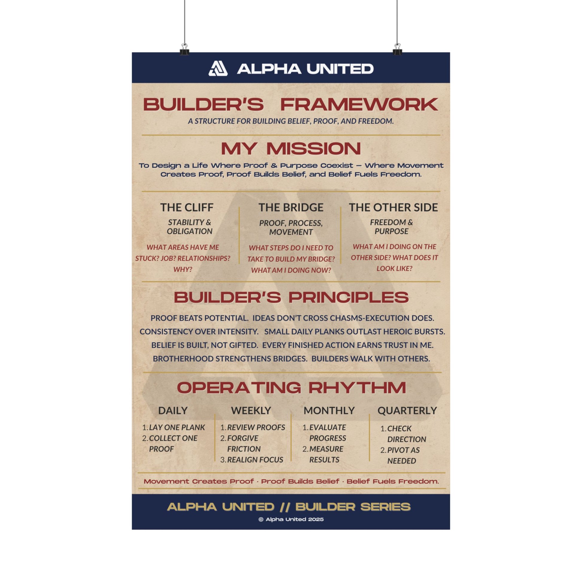 - Full Builder's Framework manifesto with principles and operating rhythm